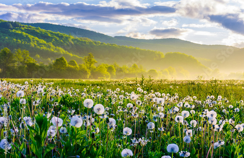 dandelion field on foggy sunrise. beautiful agricultural scenery in mountains
