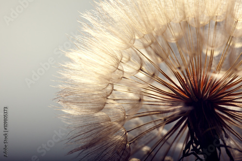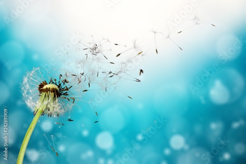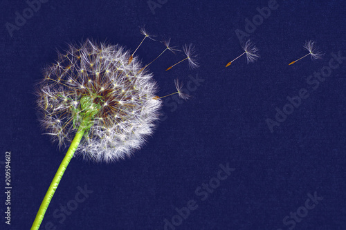 dandelion flower, white fluffy on a blue background, fly off the seeds