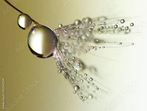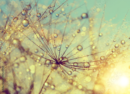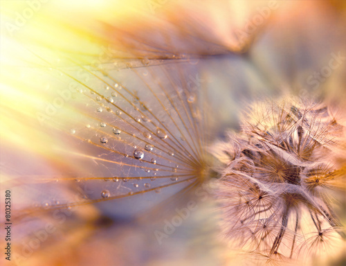 Dandelion with drops of dew in a gold color. Beautiful golden dandelion with water drops. Dandelion seed with dew on a beautiful golden background.