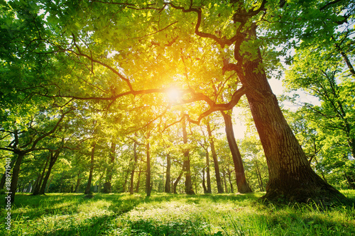 old oak tree foliage in morning light with sunlight