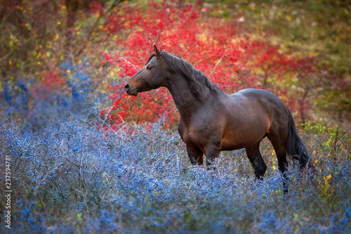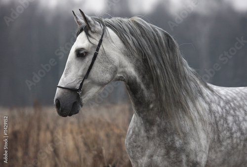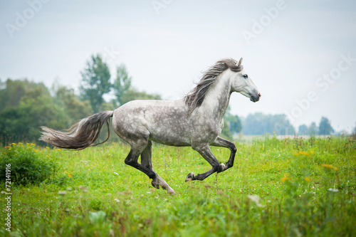 Andalusian stallion running on the pasture in autumn