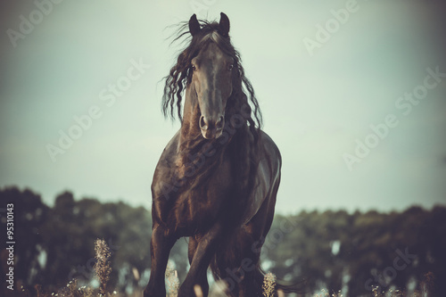 Black horse galloping on the trees and sky background in autumn