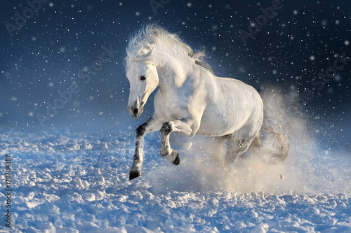 White horse run gallop in winter snow field