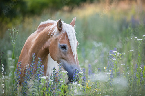 Ein Haflinger steht auf der Koppel