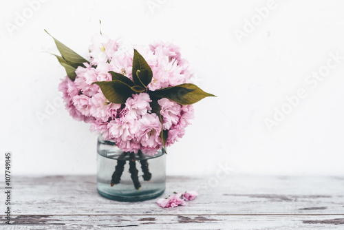 Branches of fruit tree in pink blossoms in glass vase on vintage wooden table with white background