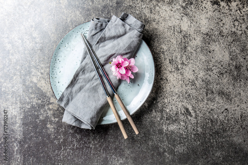 Chopsticks and sakura flowers on gray plate, stone background. Japanese food concept. Top view, copy space.