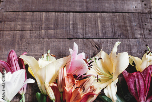 beautiful colorful lily flower on rustic wooden background. gorgeous bloom lilies on rustic wood backdrop. space for text. greeting card. celebration concept. spring background, top view.