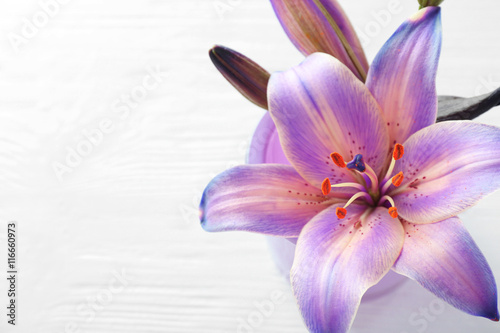 Beautiful lily on light wooden background