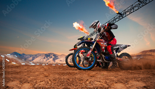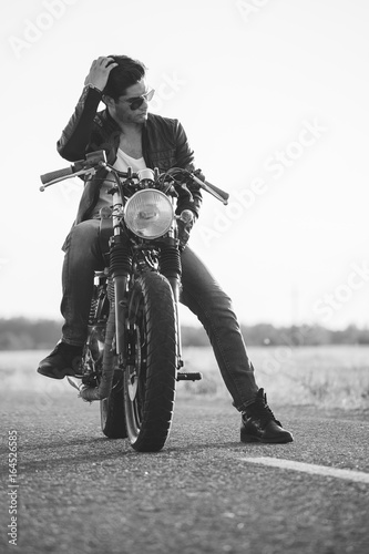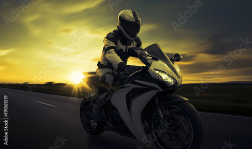 schneller Motorradfahrer auf Straße im Sonnenuntergang