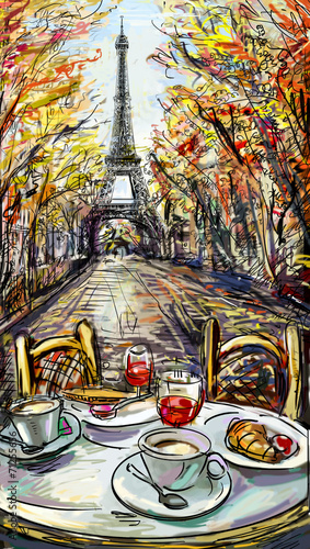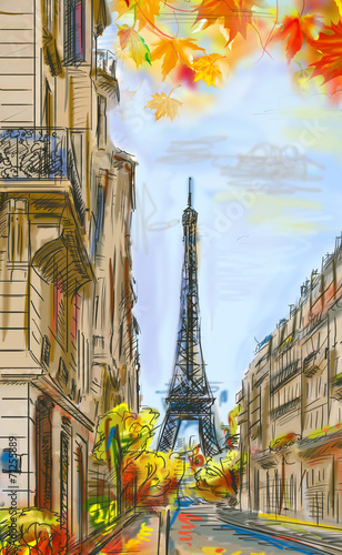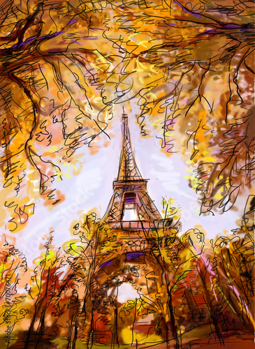 Street in autumn Paris. Eiffel tower -sketch illustration
