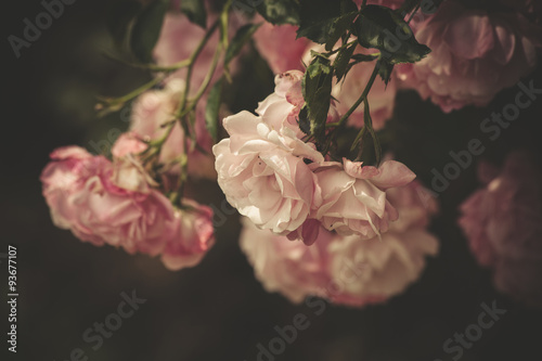 Beautiful bouquet of pink roses, flowers on a dark background, soft and romantic vintage filter, looking like an old painting