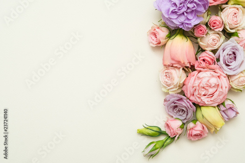 colorful flower composition on white background. roses and eustoma layout