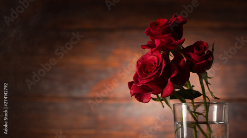 Red rose in vase on old wooden background, Vintage style