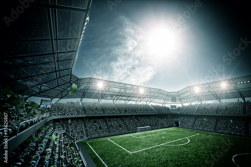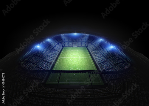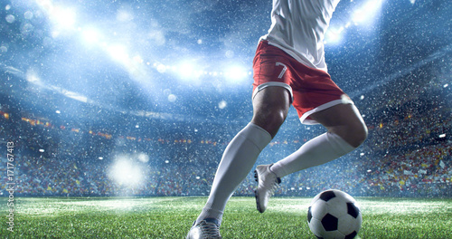 Soccer player kicks the ball on the soccer stadium. He wear unbranded sports clothes. Stadium and crowd made in 3D.