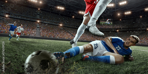 Soccer players performs an action play on a professional stadium. Two football teams fighting for the ball. Players wears unbranded sport uniform.