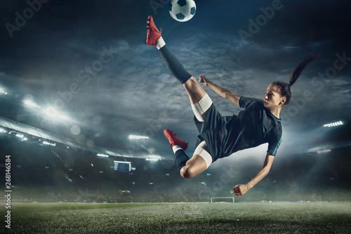 Young female soccer or football player with long hair in sportwear and boots kicking ball for the goal in jump at the stadium. Concept of healthy lifestyle, professional sport, hobby, motion, movement
