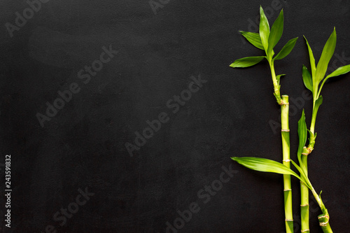 Asia background. Chinese, japanese background. Bamboo branch on black background top view copy space