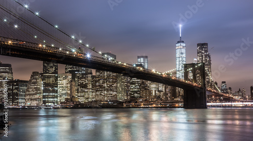 Brooklyn bridge and New York City Manhattan downtown skyline at dusk with skyscrapers illuminated over East River panorama.