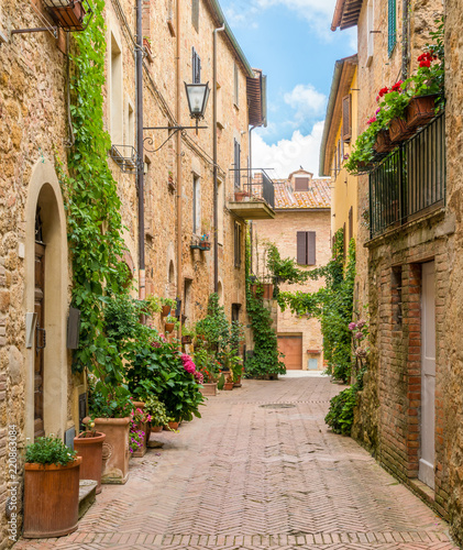 A narrow and picturesque street in Pienza, Tuscany, Italy.