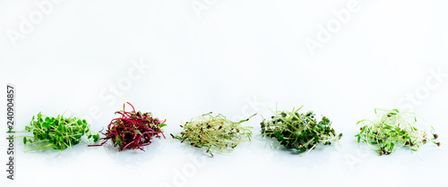 microgreen dill sprouts, radishes, mustard, arugula, mustard in the range on a light background