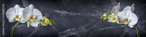 Banner with branches ofl white orchid flowers on black marble background