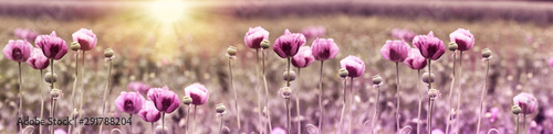 Poppy flower, purple poppy flower at sunset in meadow